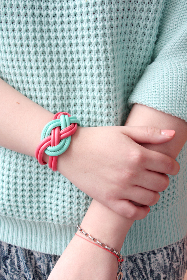 Das tolle an diesem Armband ist, dass es wirklich sehr schnell gemacht ist und ihr euch im Gegensatz zu teurem Modeschmuck so einiges spart 😉 Außerdem trägt man selbstgemachte Dinge doch viel lieber und mit ganz viel Stolz! Übrigens könnt ihr die Lederbänder auch durch farbige Kordeln ersetzen. Sieht auch toll aus und ist sogar noch ein bisschen billiger 🙂