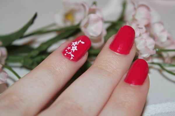 Da mich der Lack, wie gesagt, so an Frühling und gute Laune erinnert hat, musste ich mich noch an einem kleinen Nageldesign versuchen. Das komplette Stamping-Set ist übrigens von Essence und die Schablone enthält einige frühlingshafte Motive.