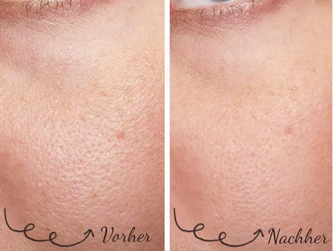 Der Unterschied von Nano zu einem normalen Primer besteht darin, dass Nano auch alleine, also ohne jegliches Make Up getragen werden kann und dann einfach ein feineres Hautbild zaubert. Wie ihr das vielleicht auf dem Foto sehen könnt, erscheint die Haut wie mit Photoshop weichgezeichnet – ein toller Effekt. Ihr sehr also meine Haut quasi „nackt“ und ich hoffe, ihr könnt erkennen, wie matt die Haut auf dem rechten Bild wirkt und wie die Tiefe der Poren kaschiert wurde. Es wirkt fast, als hätte ich Vaseline auf die Linse gegeben, um den Weichzeichnungseffekt von TV Serien aus den 80er Jahren zu erzielen 🙂