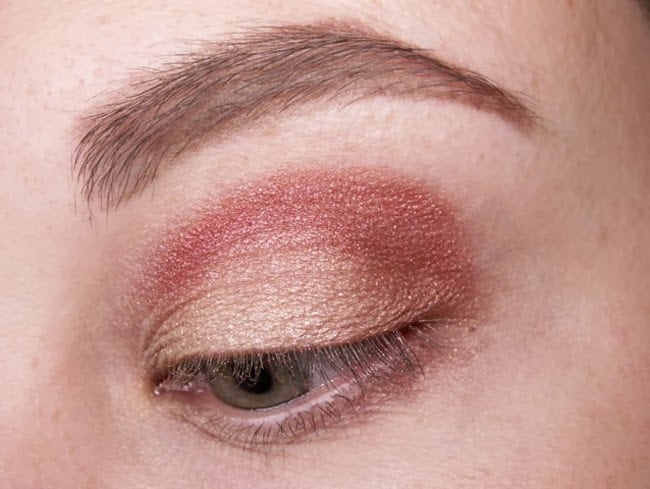 Zusätzlich zu einer hautfarbenen Base nutze ich oftmals gerne noch farbige Lidschattenstifte, da sie den Puderlidschatten meiner Meinung nach gut unterstützen. Hier kamen also der goldene Intense Eyeshadow Pencil von Yves Rocher in „Or soleil“, sowie der s-he jumbo pen in „002“ – einem silbrigen Bordeaux zum Einsatz. Aus der NYX Palette habe ich anschließend vor allem das Gold (mitte unten), Braun (mitte oben) und Rot (oben rechts) benutzt und passend zu dem Eye pencils auf dem oberen und unteren Lid aufgetragen. Ergänzend habe ich dann noch für etwas mehr Tiefe den „brown smolder“ Mono-Lidschatten von Covergirl in die Lidfalte gegeben und den Lidschatten zur Braue hin verblendet.
